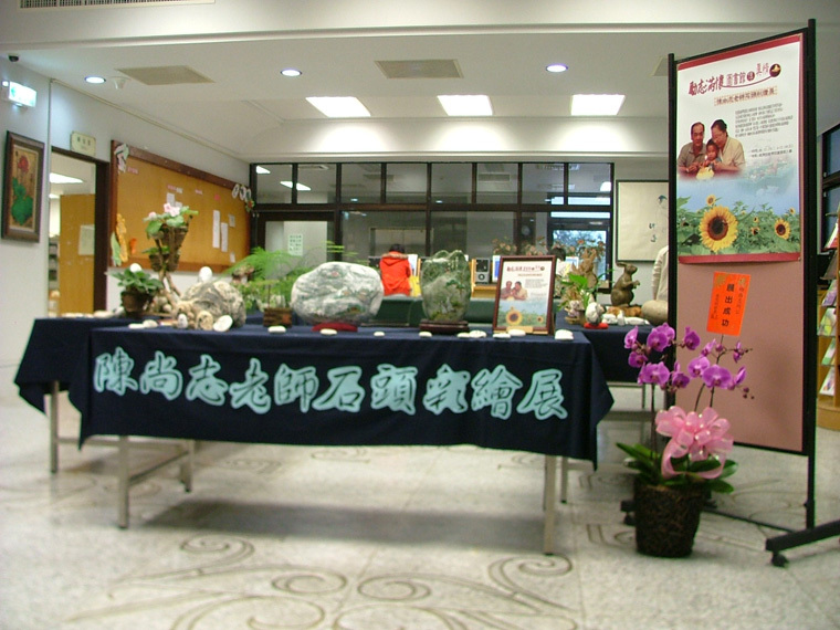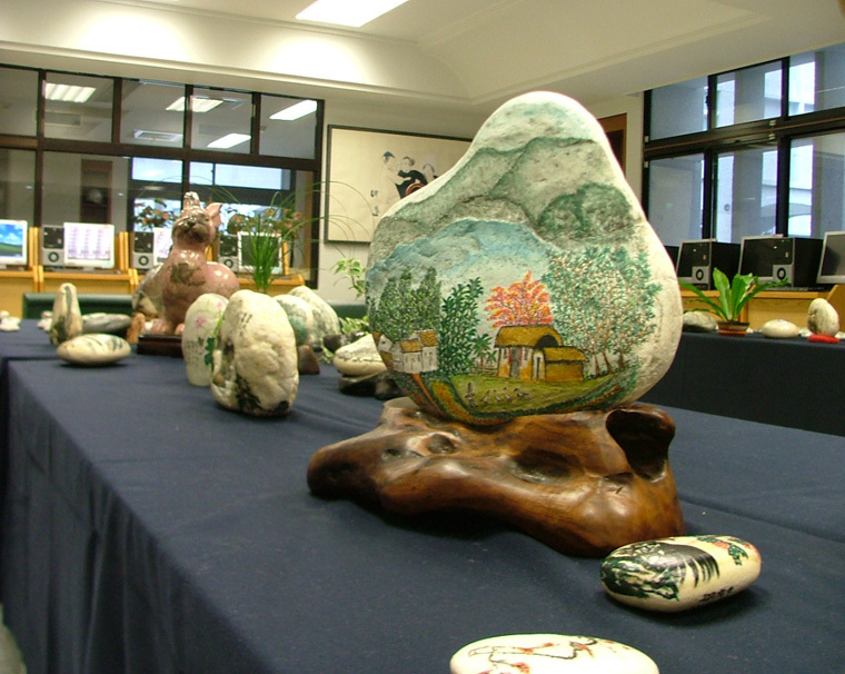愛好撿石頭,享受賞石、創作的樂趣。 拾石想你石頭彩繪展 展出時間 : 96.12.11~12.14 展出地點 : 慈濟技術學院圖書館大廳 陳尚志老師在校服務12年於92年退休。在花蓮的歲月讓陳老師迷上石頭彩繪,無師自通之下陸續完成了100多件作品,為了讓同仁一起分享石頭彩繪藝術的美妙, 老師應圖書館的邀請舉辦「拾石想你」石頭彩繪展,展出陳老師這十多年來的石頭彩繪成果, 從花鳥、動物、山水到人物,豐富多樣。今年圖書館邀請陳老師舉辦石頭彩繪個展,