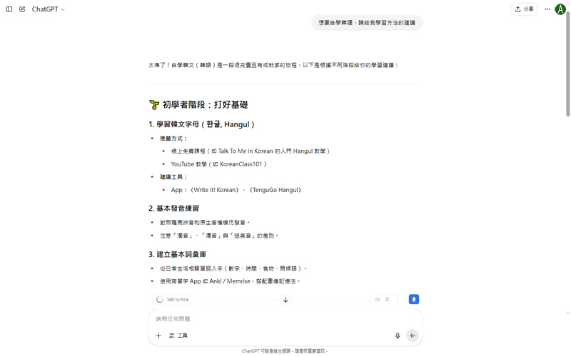 最近聽朋友分享旅遊經驗,好幾位跟我說他們現在出國自由行或在國內旅遊,出發前都會請ChatGPT規畫行程,照著ChatGPT的規劃去玩,省去很多事前做功課的時間非常方便。可見會使用AI,確實幫助很多。過往旅遊,不論國內或國外,都要翻找很多書和上網找資料,再將景點串接起來,更麻煩的是交通問題,現在可以直接跟ChatGPT進行討論,旅遊計畫可以快速生成,圖書與上網找資料成為輔助,旅遊的內容有了更完整的規劃。而運用在個人的自學語言上,ChatGPT同樣能給予很好的幫助,與ChatGPT討論自身學習語言的需求,同樣可以獲得不錯的建議。這個月主題報導換成自學韓語,其實方法同四月主題報導自學英語,可以利用ChatGPT情境模擬方式進行語言學習,或文章撰寫由ChatGPT進行批改,來更正錯誤。同時,也可以請ChatGPT給學習韓語的建議,會根據學習者的學習狀況,不同階段有不同學習的建議,當然學習語言的方法很多,ChatGPT所提供的僅是參考之一,學習者還是要根據自己的需求來準備學習的內容,語言學習是否進步,問自己最知道。
